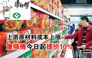 上游原材料成本的上漲,正迅速引起終端零售價的連鎖反應(yīng),康師傅率先打出了漲價的旗號。