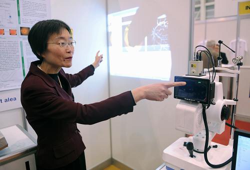4月6日,在瑞士城市日內瓦舉行的第39屆發明展上,中國香港理工大學的尤佳博士展示新型無創計算機輔助測試糖尿病系統。新華社記者于洋攝