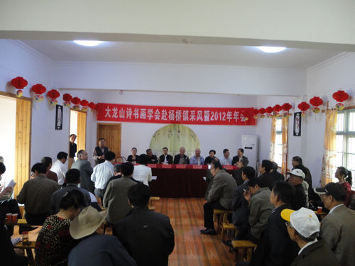 近日,大龍山詩書畫學會2012年年會在楊橋鎮召開,區委常委、副區長高青琳、市詩詞學會會長潘忠堯、著名畫家孫浩群、市老年詩聯研究會會長程維清、區老年大學校長汪文鑫、大龍山詩書畫學會會長陳逸如、區文廣新局局長曹金寶、區委宣傳部副部長郝燕燕、楊橋鎮黨委書記陳富斌等領導同志參加了會議并講話。 大龍山詩書畫學會會員先后參觀了楊橋鎮震后安置房宣店安置小區,楊橋鎮宣店社區旺福娃幼兒園,鮑沖湖村林業開發項目,通過參觀和實地采風了解到了楊橋鎮近幾年來經濟和社會的快速發展以及楊橋震后恢復重建所取得的成績,為此,大龍山詩書畫學會會員為楊橋的發展題寫了詩詞。(江立新)
