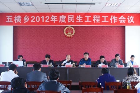 4月19日,五橫鄉召開2012年度民生工程工作會議,學習上級相關文件精神,全面安排部署2012年度全鄉各項民生工程工作。鄉長余永創、各責任部門分管同志、各村(社區)書記、主任及相關民生工程實施單位負責同志參加會議。