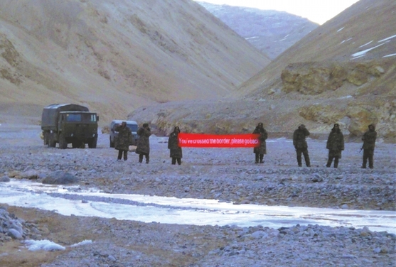 圖片說明:印媒發布的照片顯示,中國軍人5日打出英文橫幅勸印軍后撤。