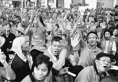 本報記者在現場看到,來自泰國全國各府的“紅衫軍”從早上陸續聚集到市中心商業區。泰國警方估計,約4萬人參加了集會,警方調集了2000多名警力維持秩序。負責安全事務的泰國副總理差林表示,集會是象征性的紀念活動,不會發生暴力事件。
