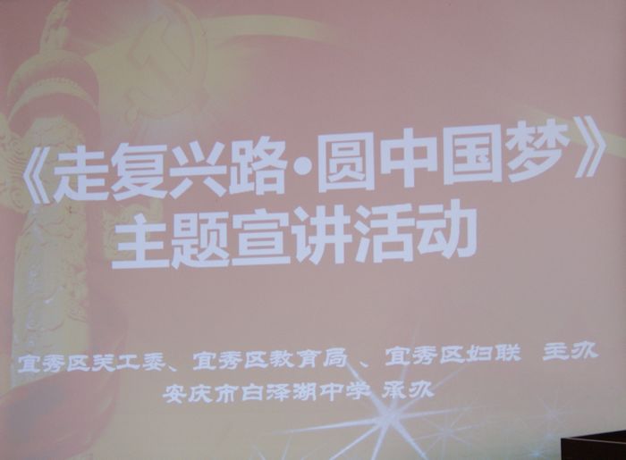 2013年11月19日,由宜秀區關工委、區教育局、區婦聯聯合主辦,白澤湖中學承辦的“走復興路 國中國夢”大型巡回宣講活動在白澤湖中學舉行。區關工委的名譽主任、執行主任、常務主任等9位老同志,區教育局、區婦、區老干局的主要負責同志參加了宣講報告會,白澤湖中學200余名學生聆聽了報告。