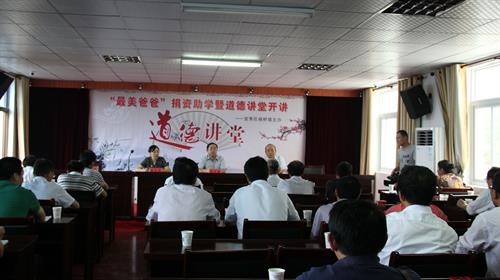 啟動儀式上,區(qū)政協(xié)主席劉華、區(qū)委常委、宣傳部長朱學(xué)云共同為楊橋鎮(zhèn)道德講堂揭牌。講堂內(nèi)先后播放了黃梅小戲“最美爸爸”和楊橋鎮(zhèn)文明創(chuàng)建宣傳片,其中“最美爸爸”一片真實再現(xiàn)了市愛心企業(yè)家—魯世鋼背著殘疾學(xué)生汪輝參加高考、到醫(yī)院進(jìn)行治病,并背其到大學(xué)報到的愛心事跡,大家全神貫注地觀看著影片,很多學(xué)員深受感動,甚至情不自禁地流下熱淚。