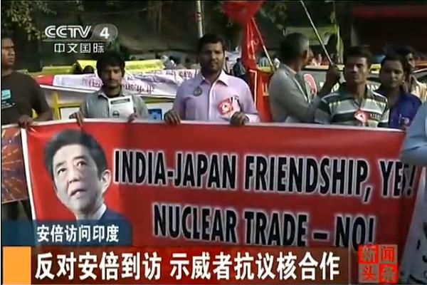 實際上,安倍的訪問并非受到所有日本民眾的歡迎,在其抵印之前,反對安倍到訪的活動就已經拉開了帷幕。24日,在印度孟買,示威者手舉橫幅進行了反對促成日印核能協定簽訂的抗議活動。(鄭青亭)
