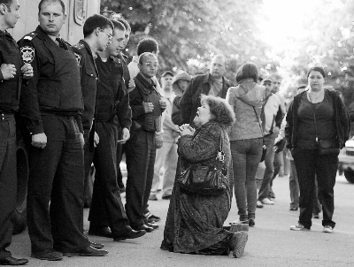 7日,烏克蘭馬里烏波爾,一名被警察拘捕的親俄分子的母親跪在警察面前請求釋放她的兒子 供圖/IC