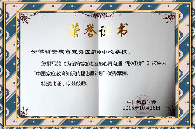 近日,由宜秀區羅嶺中心學校“彩虹橋”項目組撰寫的實踐報告——《為留守家庭搭建起心靈溝通的“彩虹橋”》一文經《知心姐姐》雜志社推薦,勇闖專家評審、網絡投票等環節,最終獲評“中國家庭教育知識傳播激勵計劃優秀案例”。