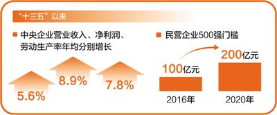 國企規(guī)模實力持續(xù)增強(qiáng),效益穩(wěn)步提高。預(yù)計到今年底,中央企業(yè)資產(chǎn)總額將接近69萬億元,比“十二五”末增長45%。“十三五”以來,中央企業(yè)營業(yè)收入、凈利潤、勞動生產(chǎn)率年均分別增長5.6%、8.9%、7.8%,進(jìn)入世界500強(qiáng)的中央企業(yè)達(dá)到48家。民企改革發(fā)展成效顯著。“十三五”以來,民營企業(yè)500強(qiáng)門檻從2016年的100億元提升至2020年的200億元;創(chuàng)新創(chuàng)業(yè)創(chuàng)造熱情高漲,中小企業(yè)數(shù)量增長近1倍。